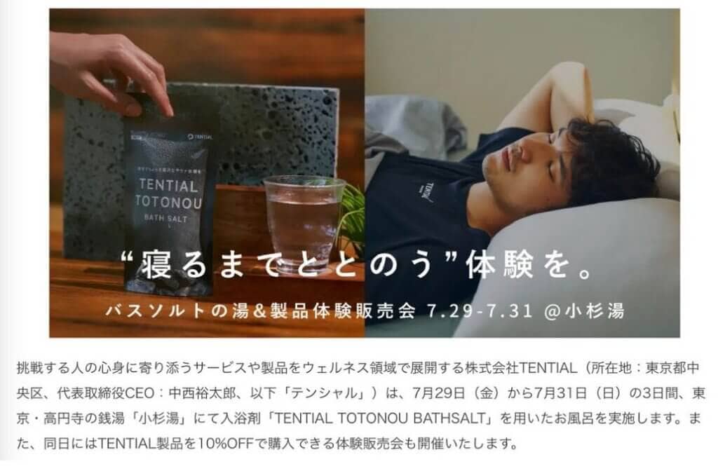 たとえば、2022年7月に開催された東京・高円寺でのキャンペーンでは、提携銭湯の利用で『BAKUNE』シリーズを始めとするTENTIAL製品が10%オフで購入できたそうです!